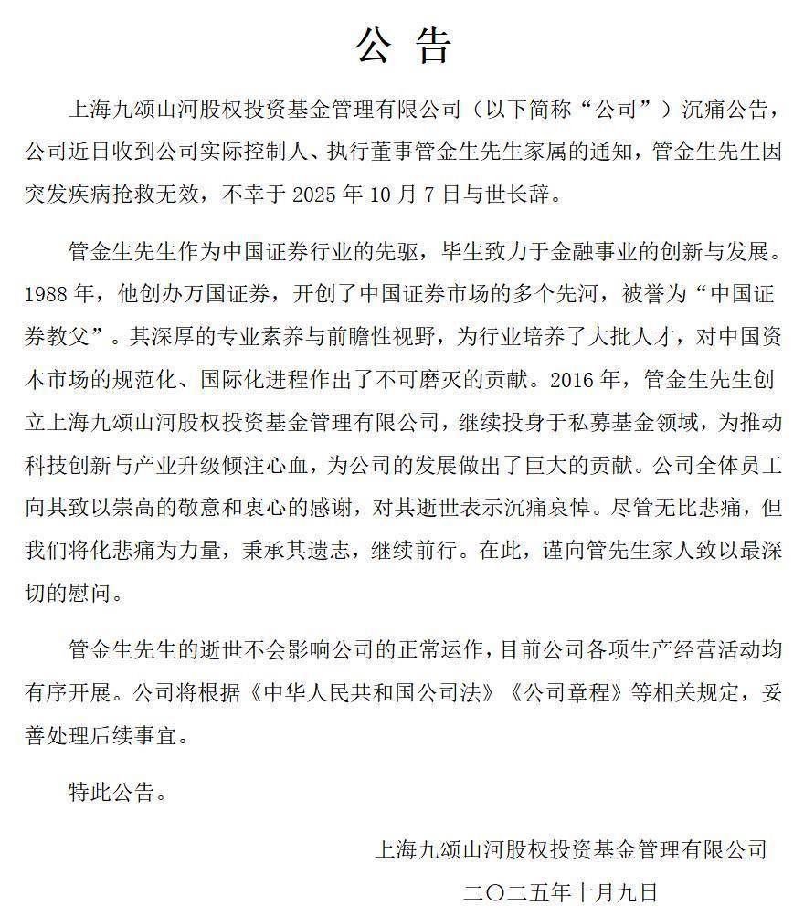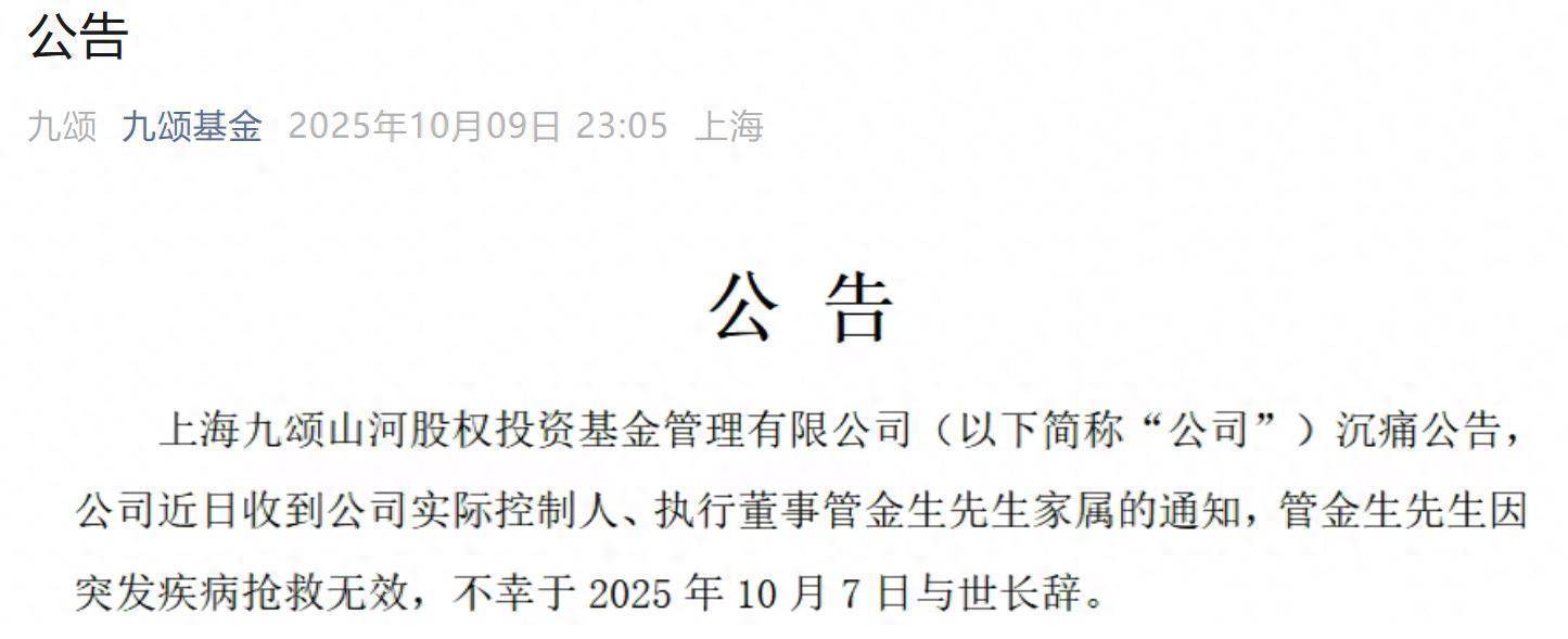 10月9日深夜,九颂基金通过微信公众号发布公告,公司实际控制人、执行董事管金生先生因突发疾病抢救无效,不幸于2025年10月7日与世长辞。