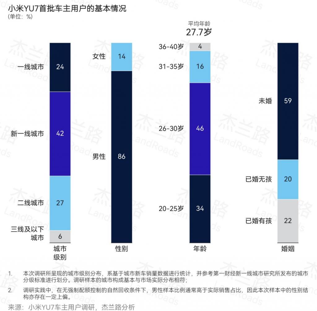 过去新能源汽车的主要受众,有相当一部分是追求新潮科技、热衷于性能参数的年轻消费者,根据杰兰路发布的报告,小米 YU7 首批车主平均年龄仅为 27.7 岁,80%集中在 20-30 岁之间,且大多来自一二线城市。