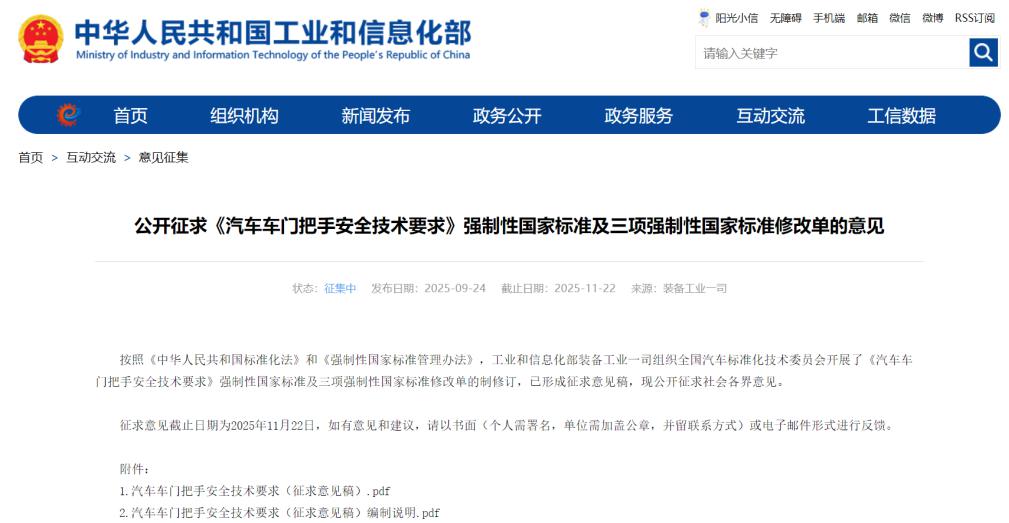 9 月 24 日,工业和信息化部装备工业一司对《汽车车门把手安全技术要求》强制性国家标准及三项强制性国家标准修改单公开征求意见,其中明确规定了车门门把手相对车身表面应具备的手部操作空间标准,剑指曾造成诸多安全事故的隐藏式车门把手。